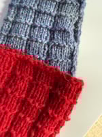 Studio Cuffs are knitted flat and seamed with a crochet hook, either totally or with room left for your thumb. The edge is on the outside giving the cuffs a sturdy look.